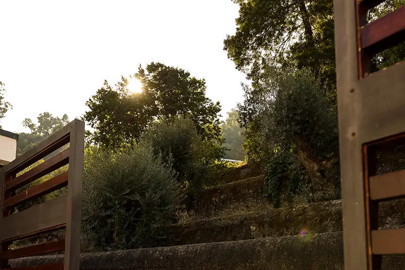 Mas o que define este lugar não se resume ao que os olhos alcançam. Aqui, o silêncio tem texturas. Ouvem-se passarinhos a preencher os intervalos entre o que foi dito e o que ainda está por dizer. Ouvem-se folhas que se agitam mesmo sem vento. E ouve-se o comboio, sempre ele, a cortar o vale como um marcador do tempo, lembrando que há um mundo que continua a correr, mesmo quando decidimos abrandar.