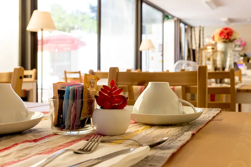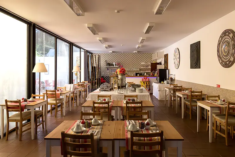No interior, os quartos contam com casa de banho privativa, ar condicionado, ligação à internet e acesso direto à zona de lazer. Não há excessos, mas há conforto. E o pequeno-almoço, servido em estilo buffet, segue a mesma lógica: essencial, fresco, honesto. Nada de gourmetizações, apenas o suficiente para começar o dia com calma e barriga cheia.
