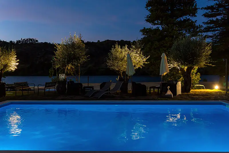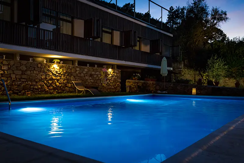 A piscina exterior, bem posicionada, oferece uma alternativa mais cálida à água do rio. Em dias mais frescos ou para quem prefere menos corrente, é um descanso bem-vindo, com a vantagem de continuar a nadar com a mesma vista.