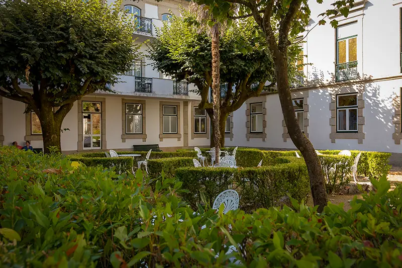 A arquitetura mistura o charme da época termal com o conforto dos dias de hoje. Lá dentro, tudo respira calma: os soalhos que rangem com elegância, os tectos altos, os quartos com vista para o arvoredo e os jardins que se estendem como um prolongamento do próprio edifício. Não há pressas nos passos nem ruídos fora do lugar, apenas a cadência natural de um espaço pensado para o descanso.