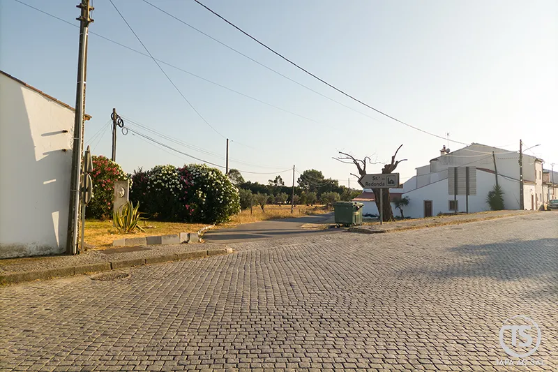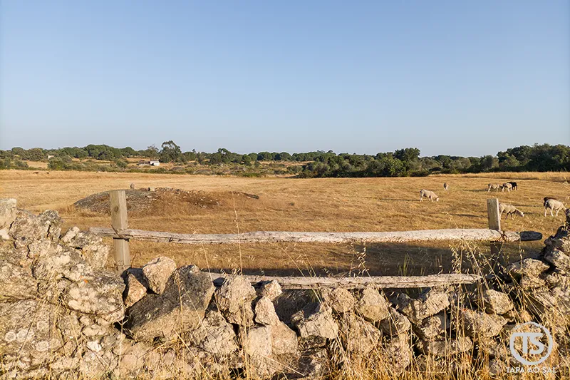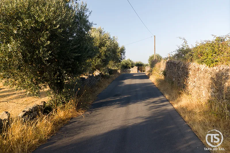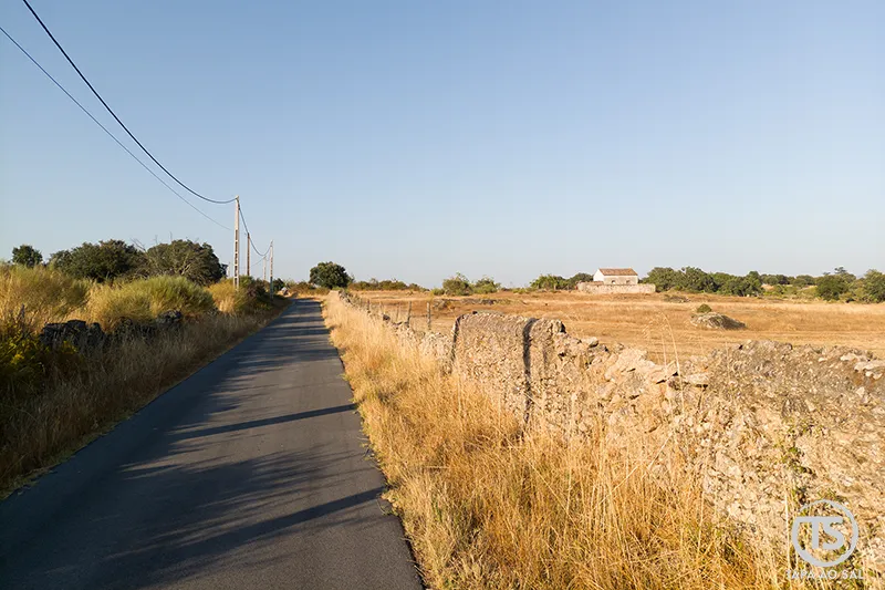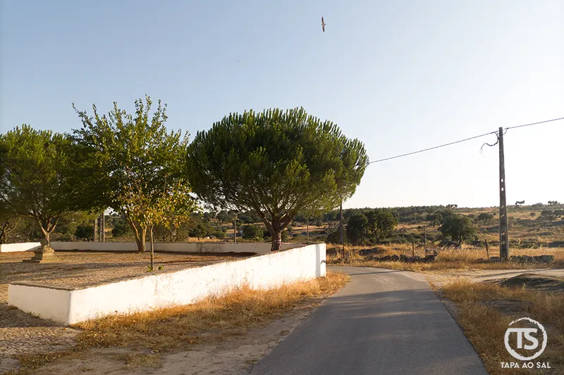 Ao sair das ruas silenciosas de Alpalhão, a estrada afina-se em fita de asfalto que se perde entre campos dourados pelo sol do Alto Alentejo. Muros de pedra, gastos pelo tempo e pelas estações, marcam o caminho. Aqui e ali, ovelhas pastam com a calma antiga de quem conhece cada sombra e cada pedra. Pequenas hortas, cuidadas com a paciência das mãos que as semeiam, abrem janelas verdes no meio do tom ocre da paisagem.