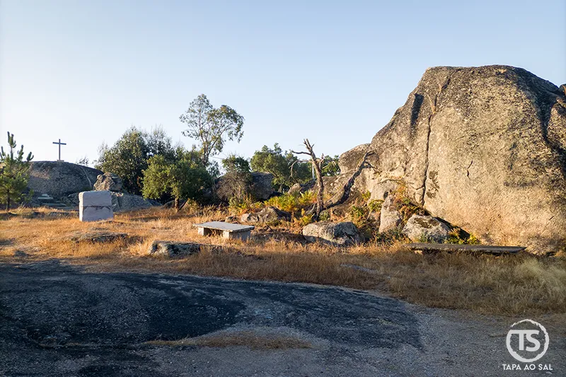 À sombra de sobreiros e oliveiras antigas, mesas de granito aguardam quem queira repousar. São o lugar certo para abrir uma merenda, beber água fresca ou simplesmente observar, a fachada branca da capela, o penedo granítico ao lado, o caminho por onde se chegou, ladeado de hortas e muros de pedra.