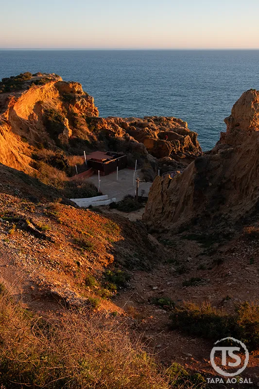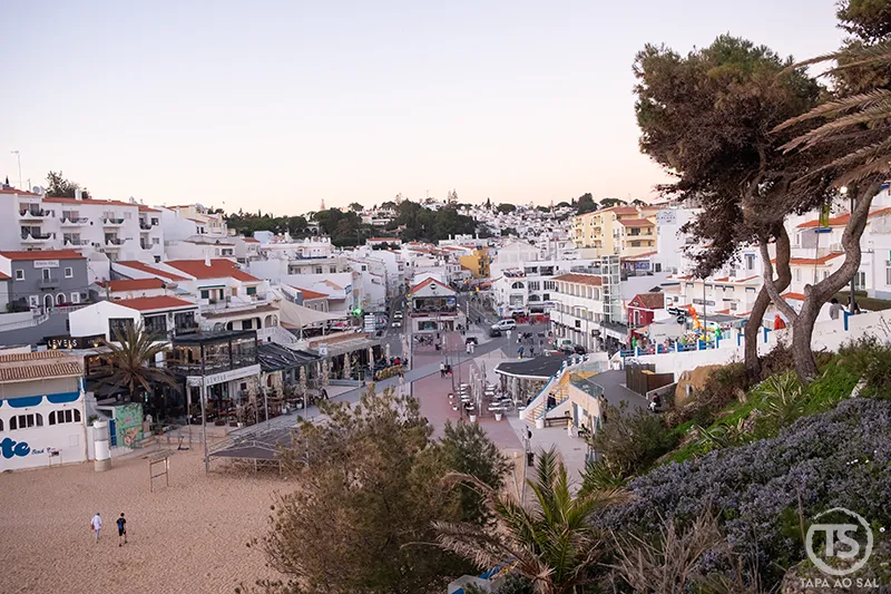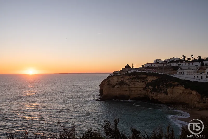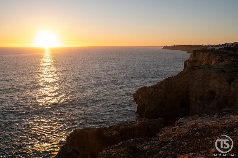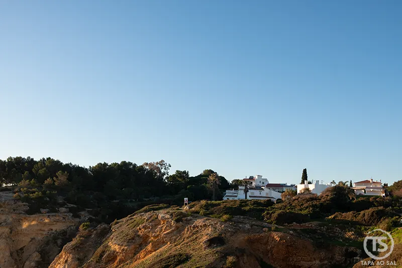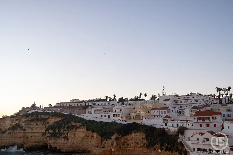 Para quem gosta de fotografia, os primeiros minutos antes do pôr do sol criam um contraste subtil entre o branco das casas e o azul profundo do mar. Vale a pena subir novamente até ao topo da vila e observar a baía de cima, onde se percebe a verdadeira dimensão das falésias do Algarve em Carvoeiro.