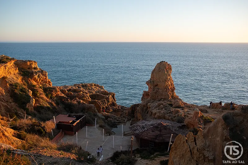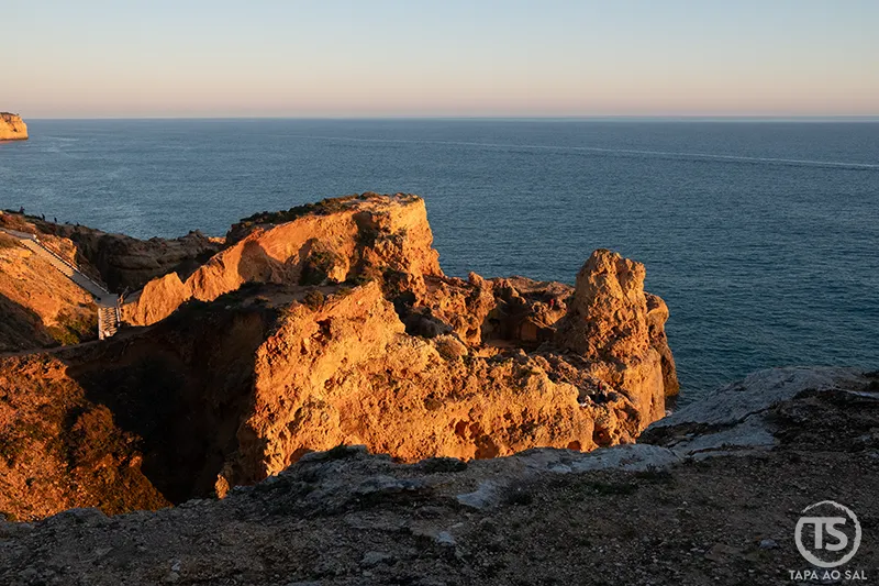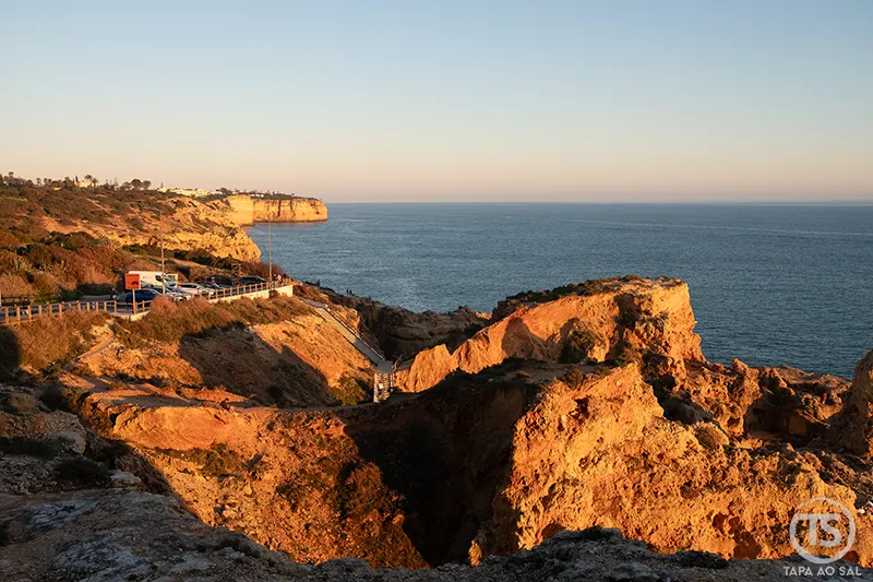 Caminhar pelos miradouros próximos ajuda a perceber a dimensão desta parte da costa algarvia. Cada recorte na pedra cria um enquadramento diferente, como se o litoral estivesse em constante transformação. Ao entardecer, a luz lateral acentua os relevos e transforma o lugar num dos cenários mais fotogénicos da região.