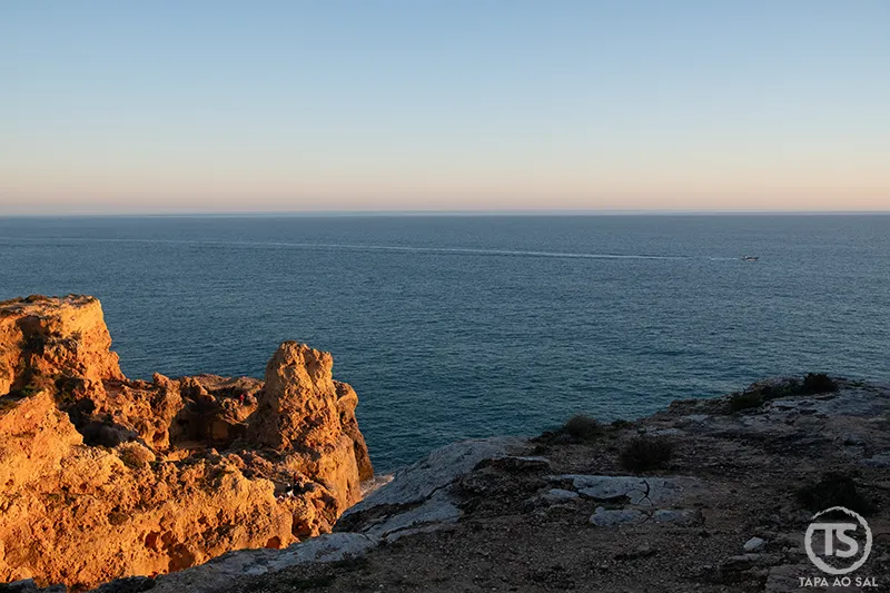 Durante a nossa visita, observámos várias embarcações a partir da falésia, deslizando sobre o mar calmo enquanto o sol começava a descer. Era fácil imaginar a sensação de atravessar aquelas formações vistas anteriormente do alto. Para quem procura essa perspetiva diferente, experiências como o passeio rápido pelas grutas de Benagil com opção de pôr do sol permitem acompanhar a mudança de luz diretamente na água, onde as cores das falésias ganham profundidade inesperada.