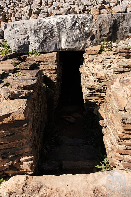 A entrada baixa e silenciosa de um dos túmulos de Alcalar ajuda a perceber a escala íntima deste espaço funerário pré-histórico. Autor: Sérgio Santos