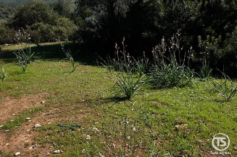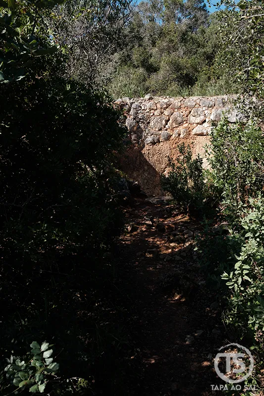 Caminho pedonal nos Monumentos Megalíticos de Alcalar entre vegetação e vestígios da necrópole