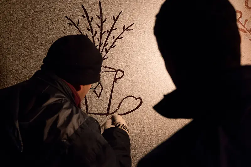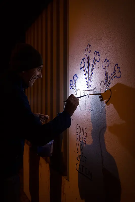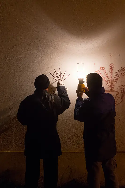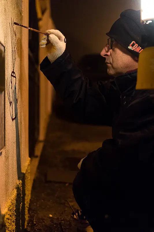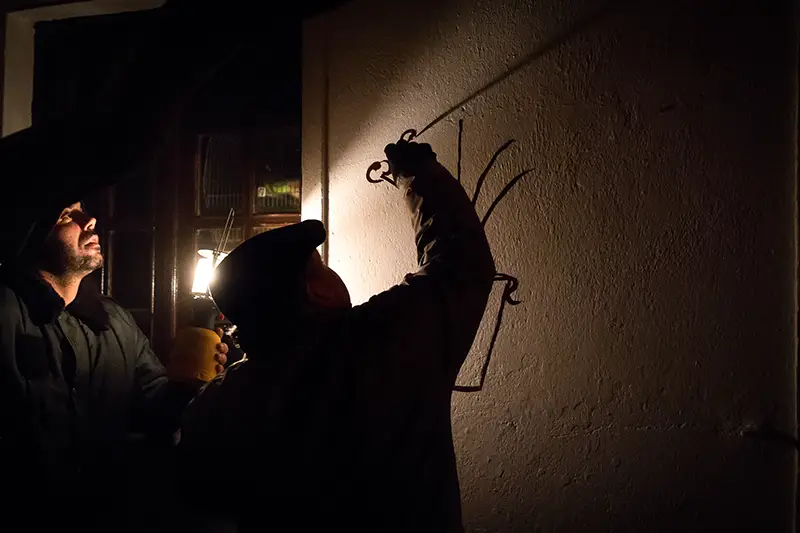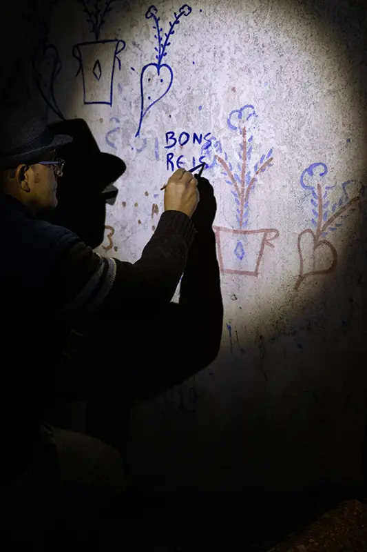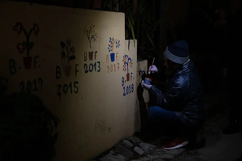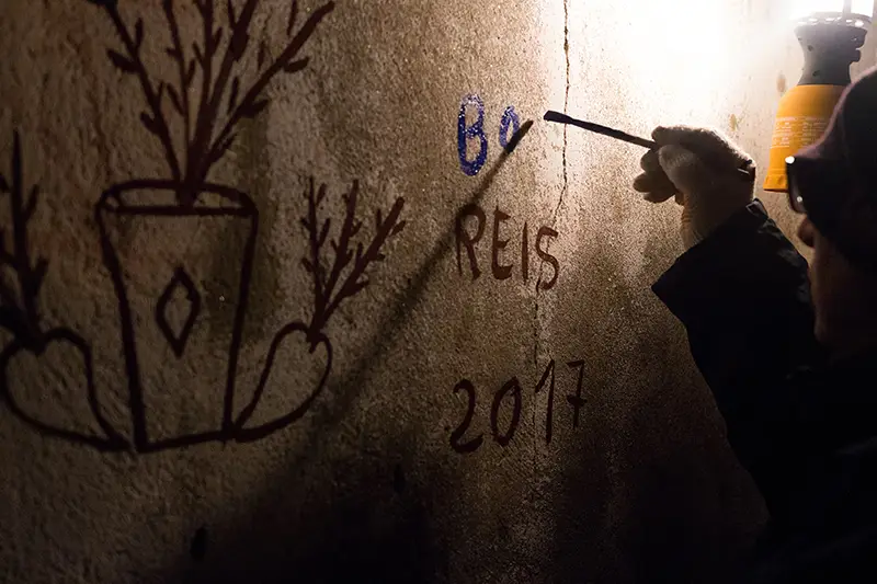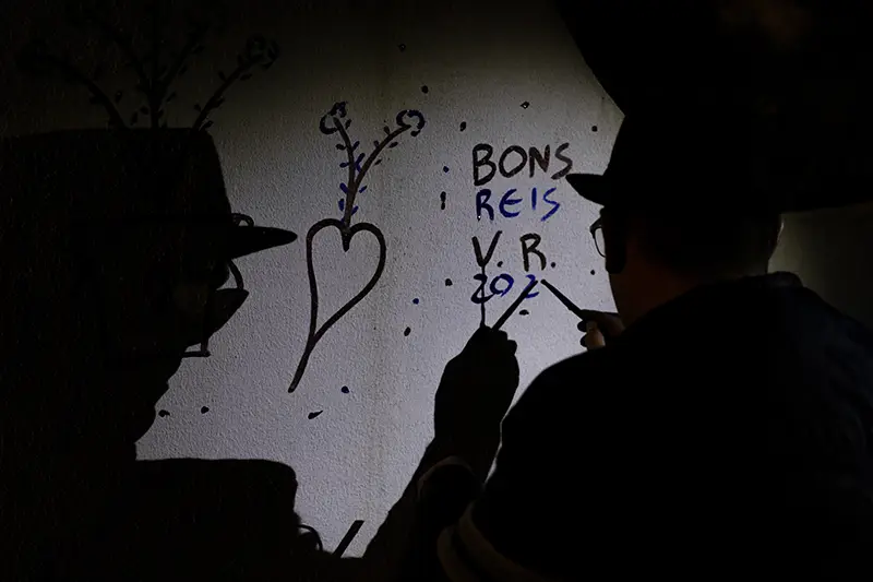 Antes de se cantar, pinta-se. É essa a ordem natural das coisas neste ritual de inverno. O grupo que encabeça a noite é o dos pintores: baldes de tinta azul e vermelha misturada com cal, pincéis gastos pelo tempo e um sentido quase sagrado do que se vai fazer. Com cuidado e arte, desenham nas fachadas das casas corações, flores, siglas como BR (Bons Reis) ou BF (Boas Festas).