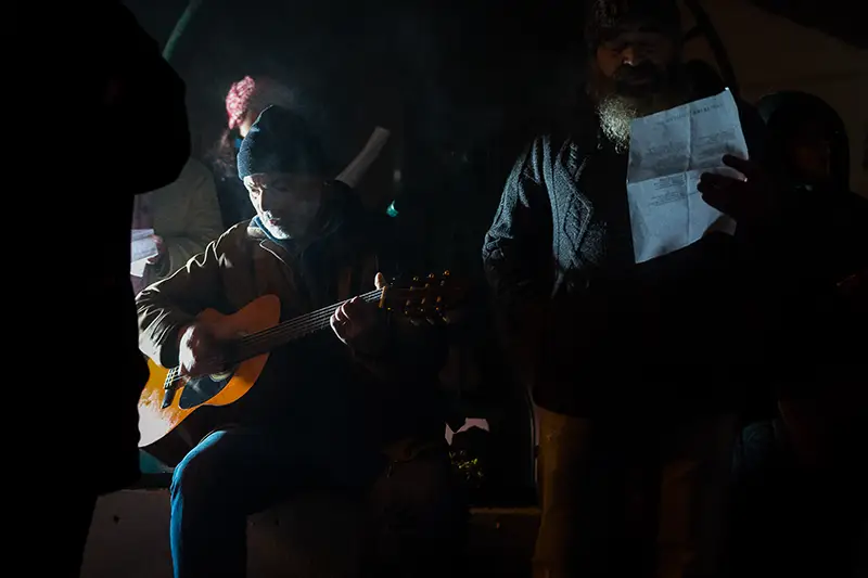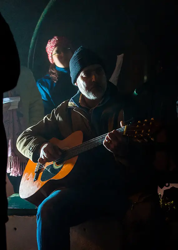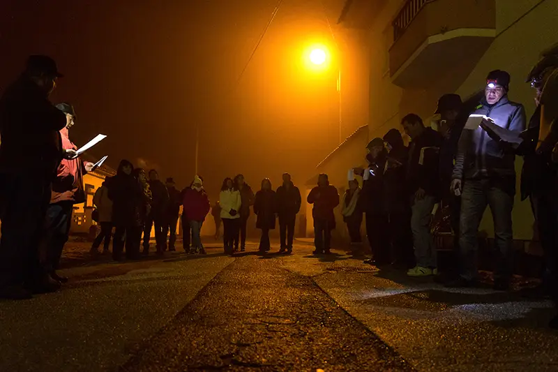 Logo atrás dos pintores, surgem os cantores. De voz afinada pelo frio e, mais tarde, pelo vinho e pelas bebidas quentes que os anfitriões servem, estes reiseiros não batem à porta. Cantam ali mesmo, do lado de fora, oferecendo versos de celebração, desejo de bom ano e fé na continuidade das coisas boas. Um canta sozinho; o grupo repete.