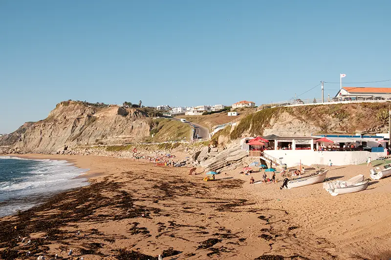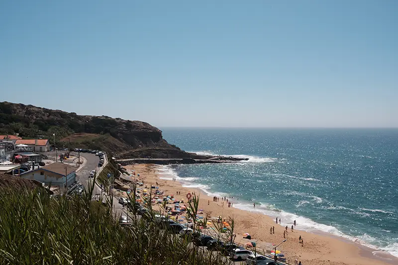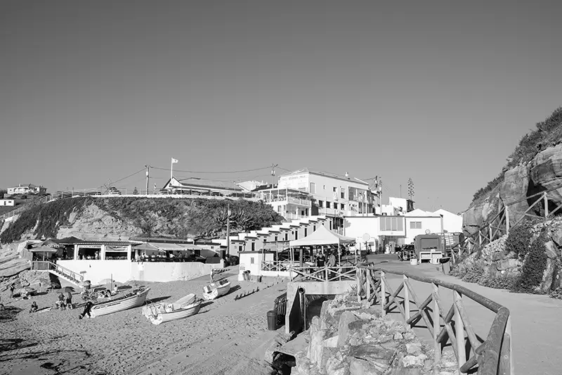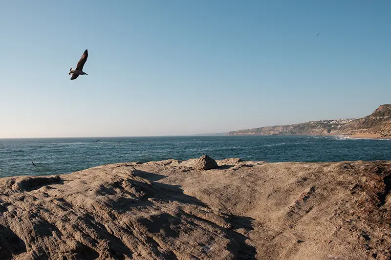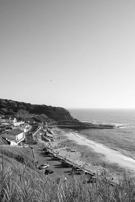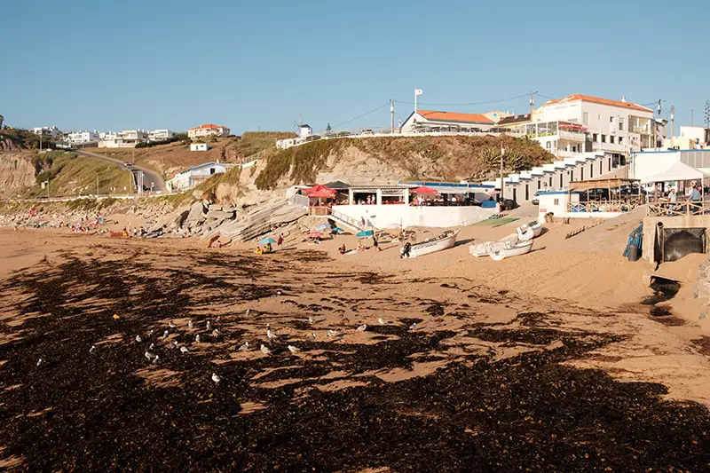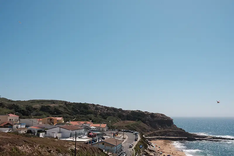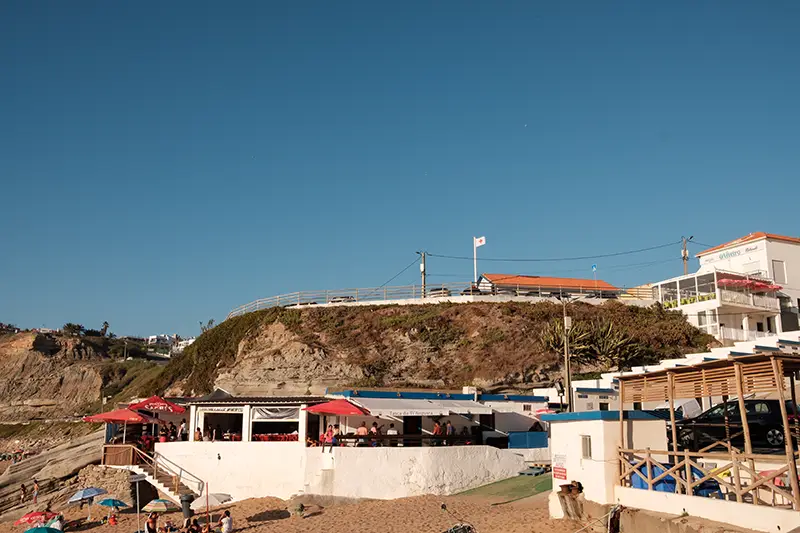 A praia encaixa-se entre duas paredes de rocha, um recorte natural na costa entre Santa Cruz e Peniche, onde as ondas chegam com a força de quem conhece esta costa há séculos. Não há grandes placas nem filas de carros a anunciar a chegada. Apenas um pequeno parque no topo da arriba, discreto, com vista para o mar e o som do vento como única receção.