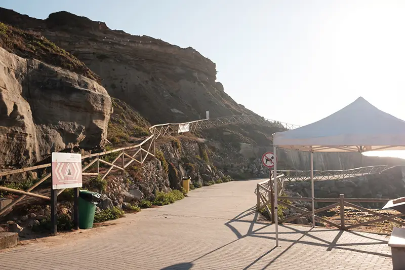 O acesso faz-se por escadas largas e uma rampa que parece escavada na própria pedra. A descida é curta, mas tem algo de cerimonial: à medida que se desce, o areal revela-se, as arribas crescem sobre os ombros, e a praia transforma-se numa espécie de anfiteatro natural onde o tempo se deita a ver o mar.