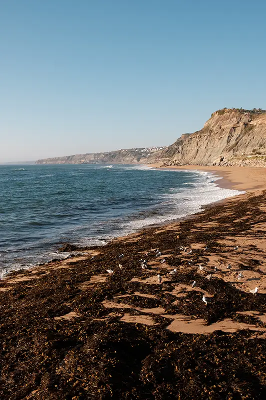 Não é uma praia de gestos largos. Não tem bares ruidosos nem passadeiras de madeira a marcar caminhos fáceis. O que oferece é outro ritmo, mais lento, mais fundo. A Praia de Porto Dinheiro, no concelho da Lourinhã, é feita de luz filtrada pelas nuvens, de escarpas que contam eras e de um mar que se aproxima sem nunca contar tudo.
