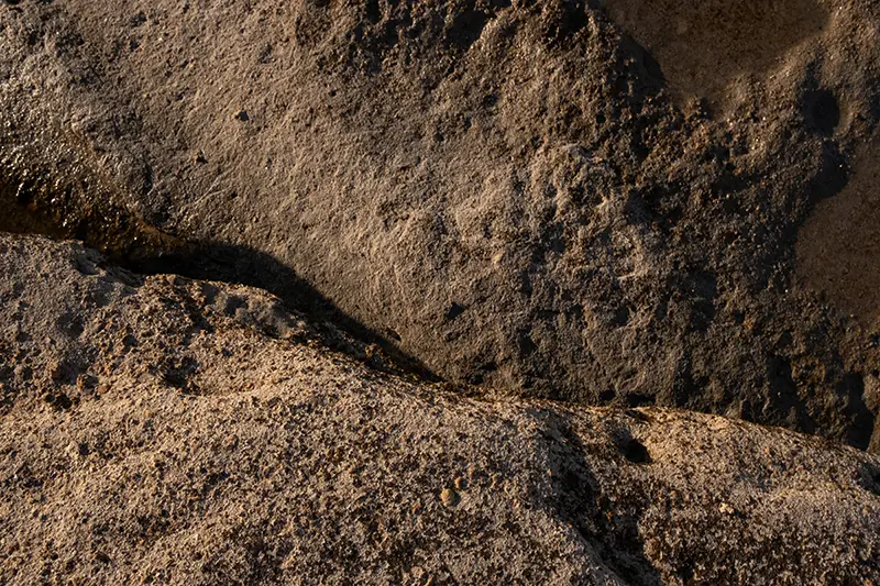 A luz muda constantemente, com o vento, com o movimento do mar, com a sombra de uma nuvem solta. Mas quando se instala, sobretudo ao amanhecer ou ao final da tarde, transforma o lugar num pequeno teatro de pedra e sombra. As falésias ganham volume, as rochas revelam texturas que à primeira vista não estavam lá. A escadaria que desce até à praia torna-se linha de composição. E a areia, tantas vezes irregular, ganha cor e forma.
