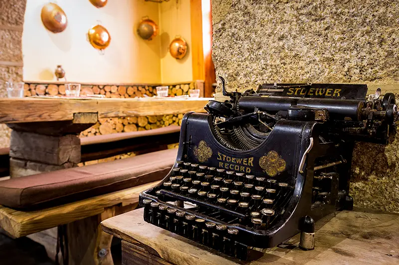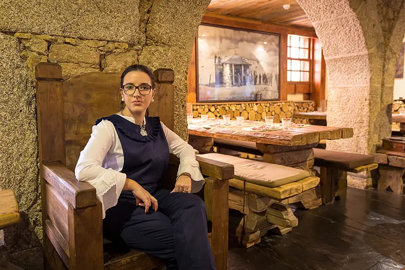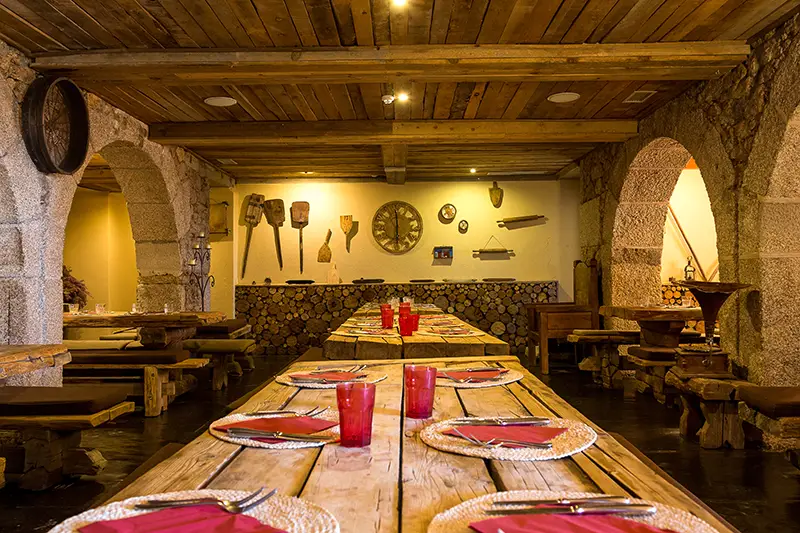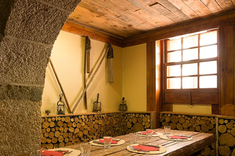 As paredes em pedra tosca, o teto em madeira escura e os detalhes em ferro forjado criam uma atmosfera que nos transporta para um outro tempo, não o medieval caricatural, mas um ambiente rústico e digno, que honra a identidade da serra.