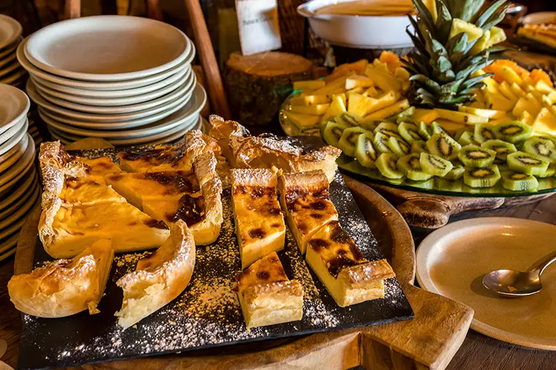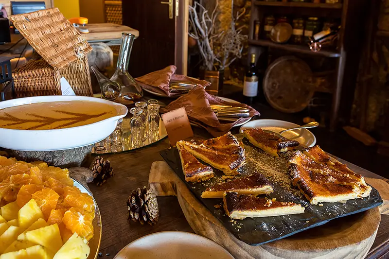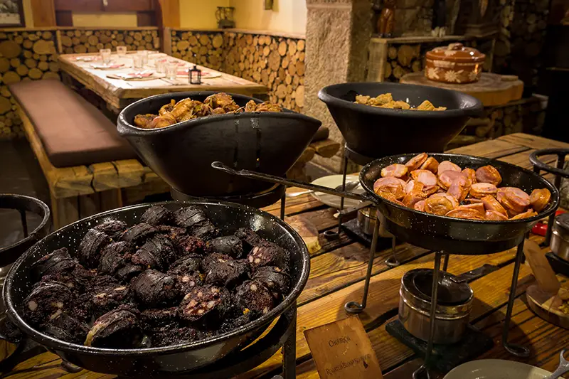 O buffet de entradas abre o apetite com generosidade: enchidos tradicionais, como chouriço caseiro e morcela de sangue, fumados com tempo e saber. Há também saladas frias, bem compostas, equilibradas, e o pão fresco da região, com crosta crocante e miolo denso, ideal para acompanhar os sabores mais intensos.