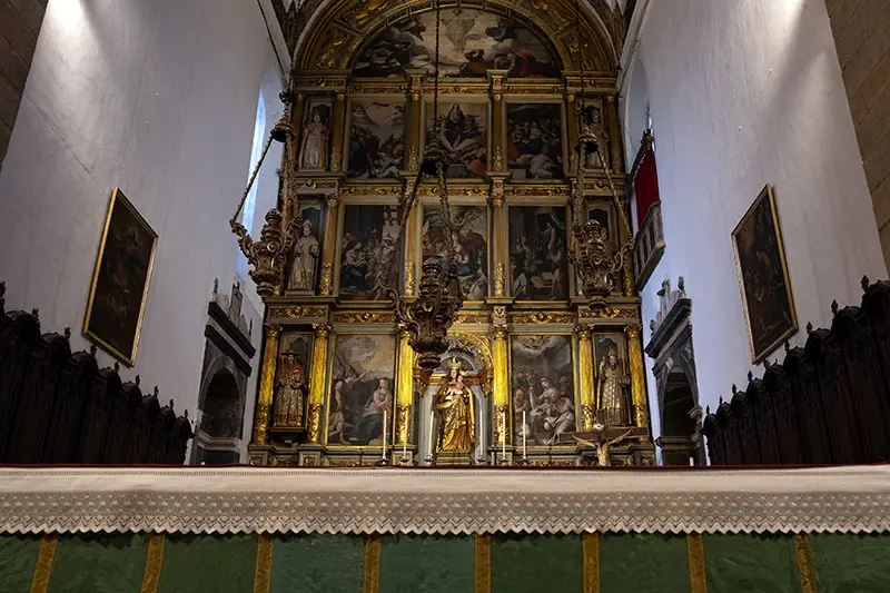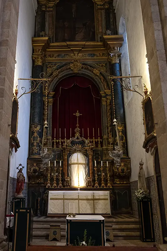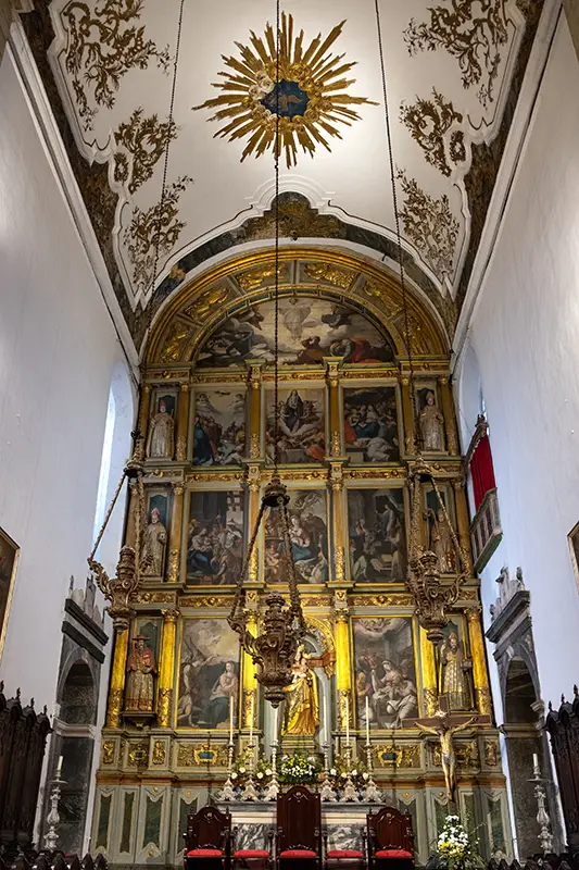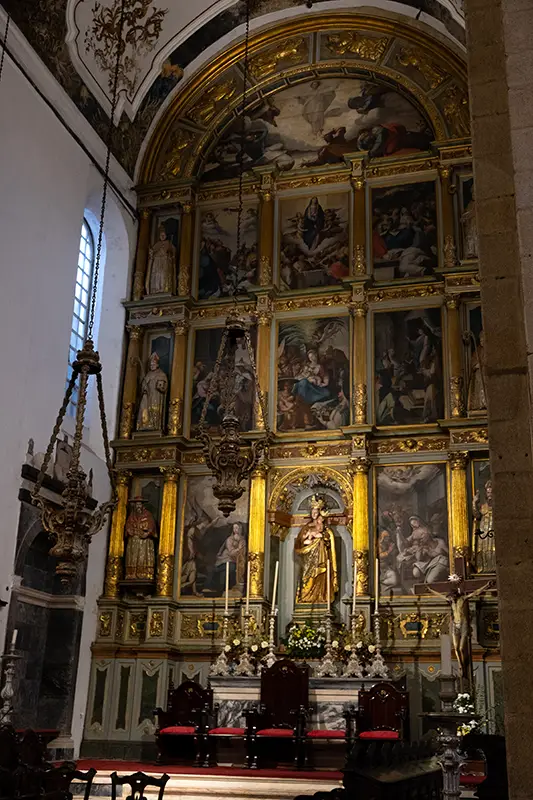 A capela-mor, com o seu retábulo monumental, aponta para o barroco já maduro. As arcadas do corpo central denunciam uma vontade renascentista de ordem. O teto, firme e austero, parece conter mais do que sustentar. E o cadeiral, entalhado com cuidado artesanal, guarda um silêncio de madeira que o tempo ainda não conseguiu romper.