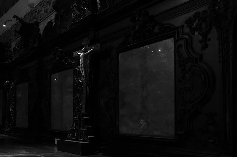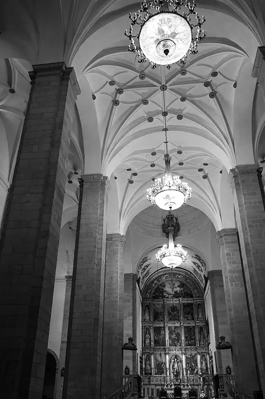 Havia zonas em penumbra onde os olhos demoravam a adaptar-se, e outras onde a luz natural desenhava quase por instinto os contornos do cadeiral, os sulcos das colunas, as pinturas nos altares. Era um lugar mais escuro, mais silencioso. Menos expositivo, mais íntimo. E foi nesse estado que a captámos: em fotografias que tentam guardar o que a luz revelou, mesmo sabendo que há silêncios que não cabem numa imagem.