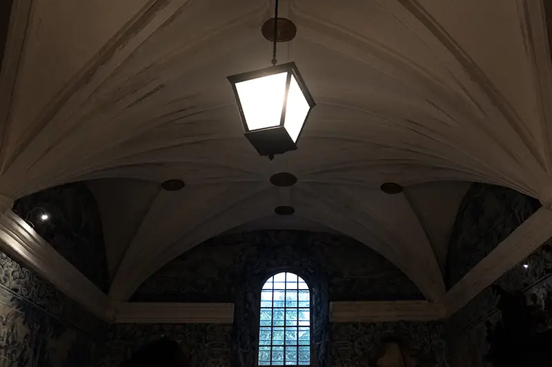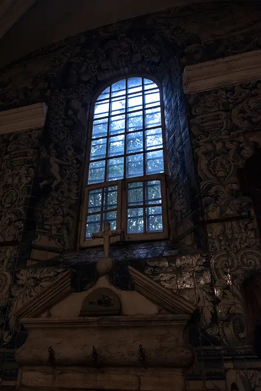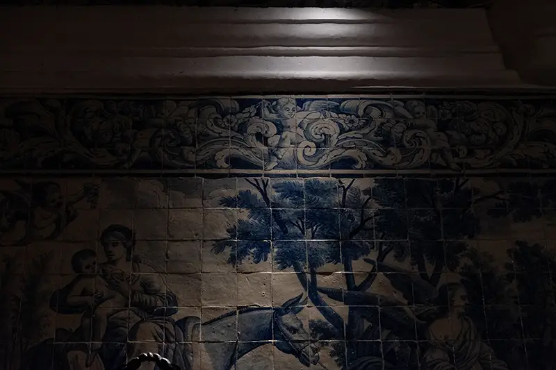 Nas paredes, painéis de azulejos sobrevivem discretamente. Uns mostram cenas religiosas; outros apenas padrões geométricos, como se a fé também pudesse ser abstrata. São traços que revelam a mão dos artistas locais, influências que vieram de fora, escolhas que foram feitas em silêncio.