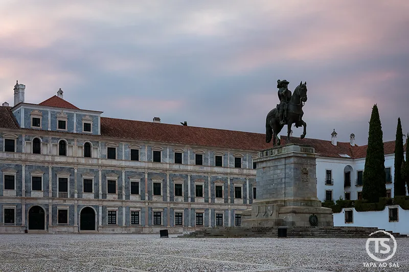 Paço Ducal de Vila Viçosa com estátua e praça em mármore sob céu azul